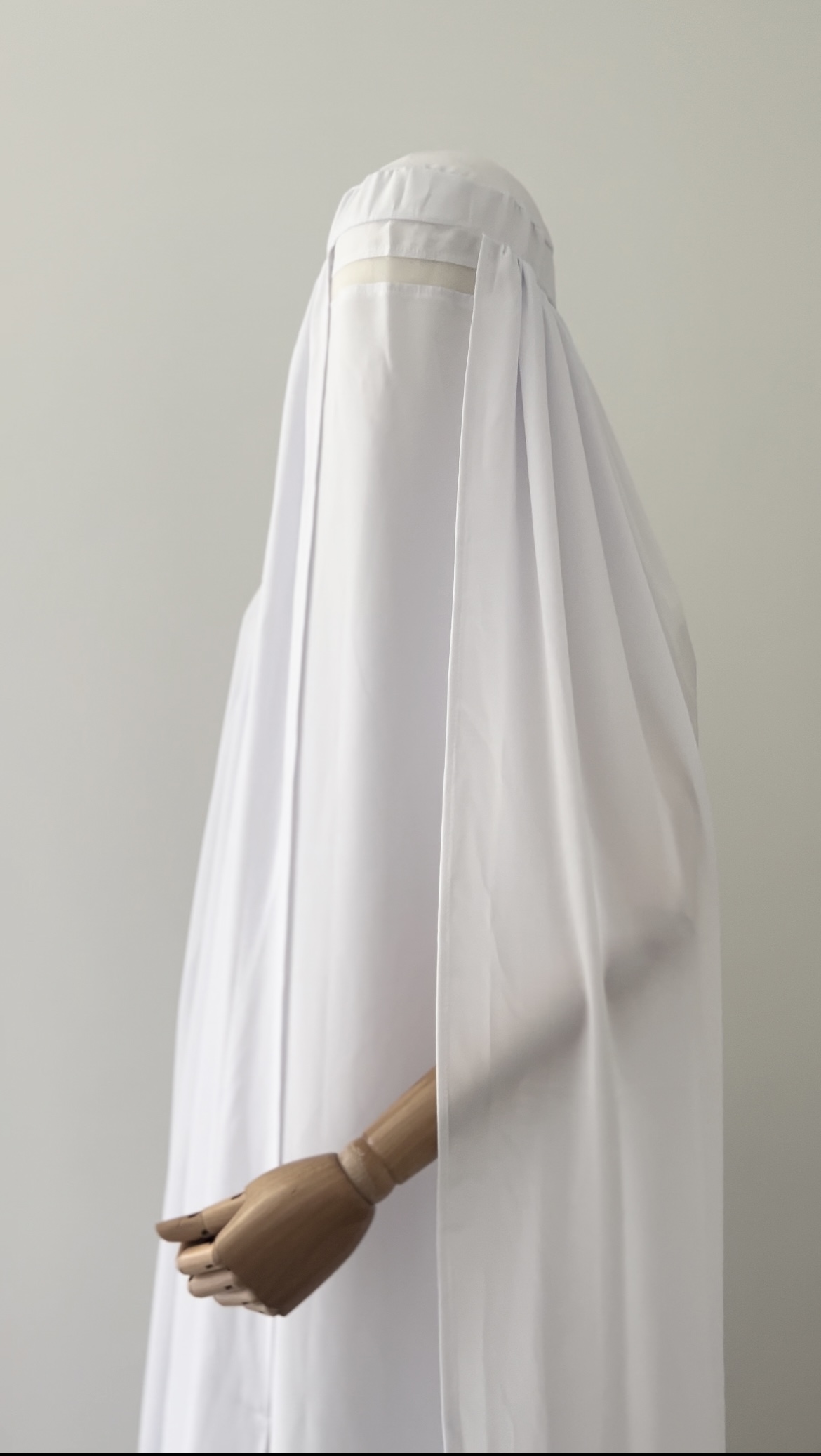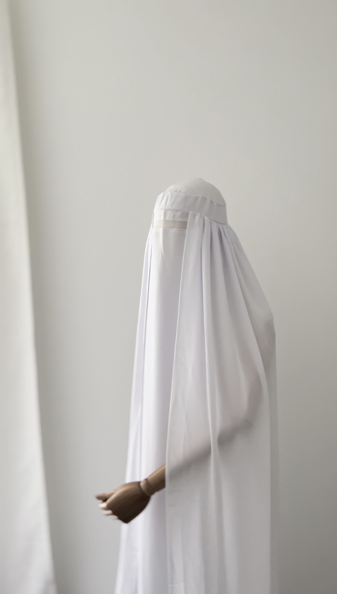 Très légère malgré sa longueur/couvrance extrême, elle ne nécessite d’aucun khimar en dessous et peut tout simplement se porter accompagnée d’une abaya.