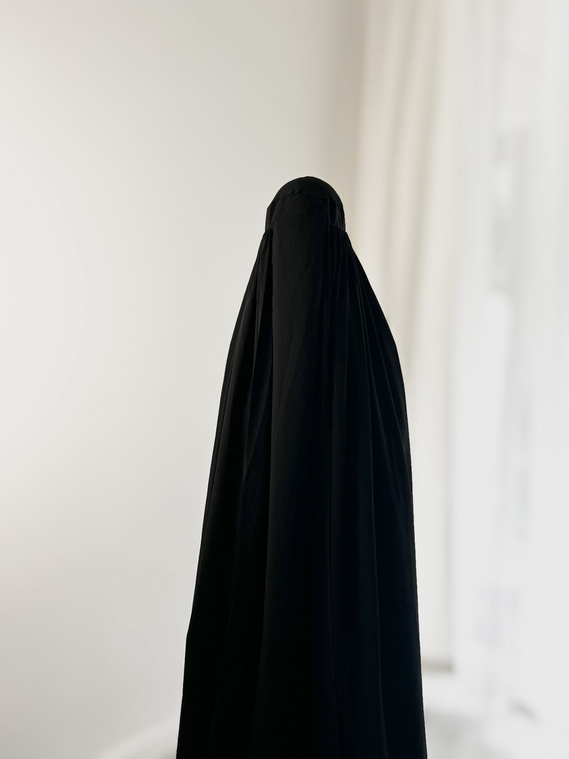 Très légère malgré sa longueur/couvrance extrême, elle ne nécessite d’aucun khimar en dessous et peut tout simplement se porter accompagnée d’une abaya.