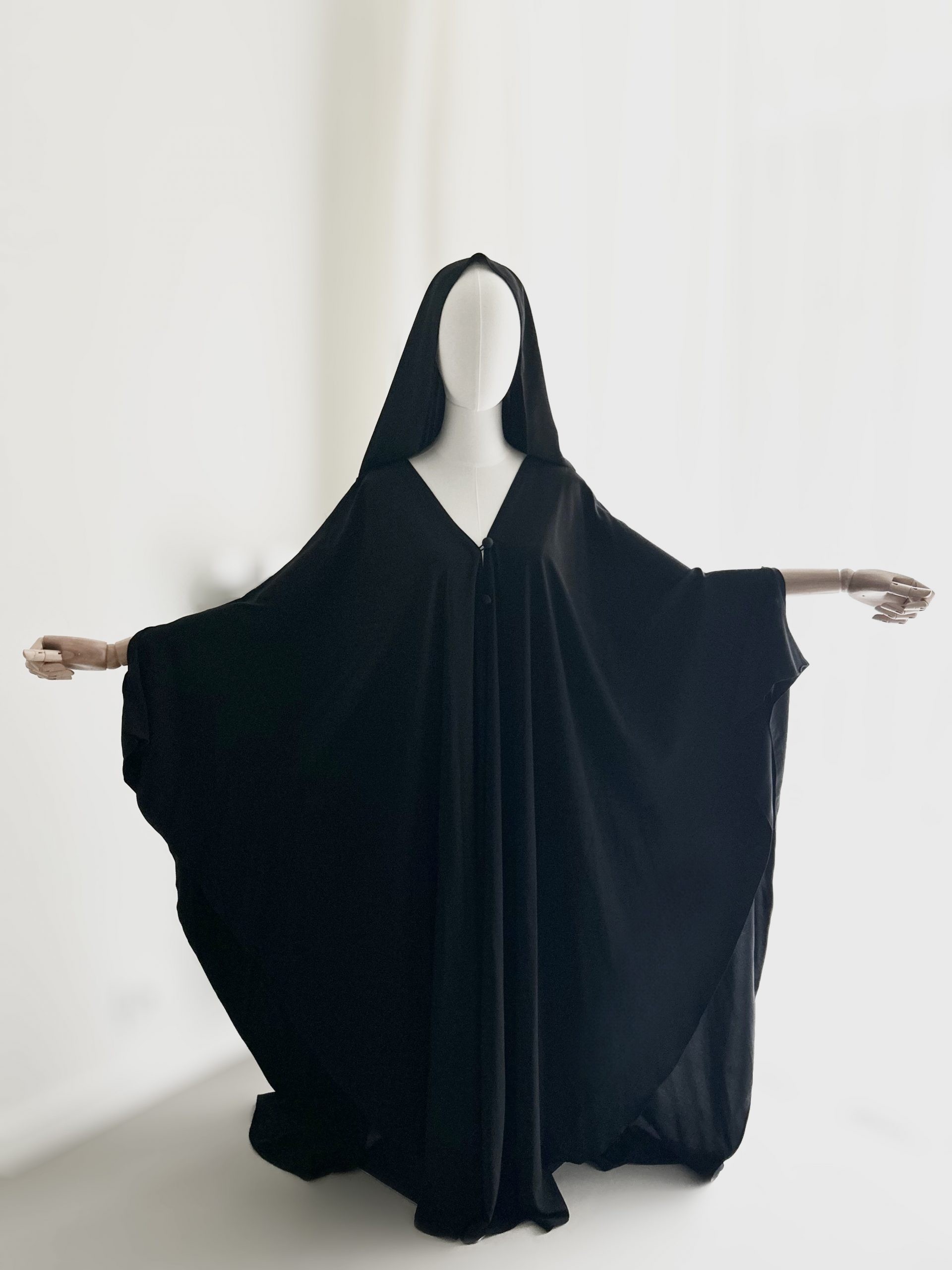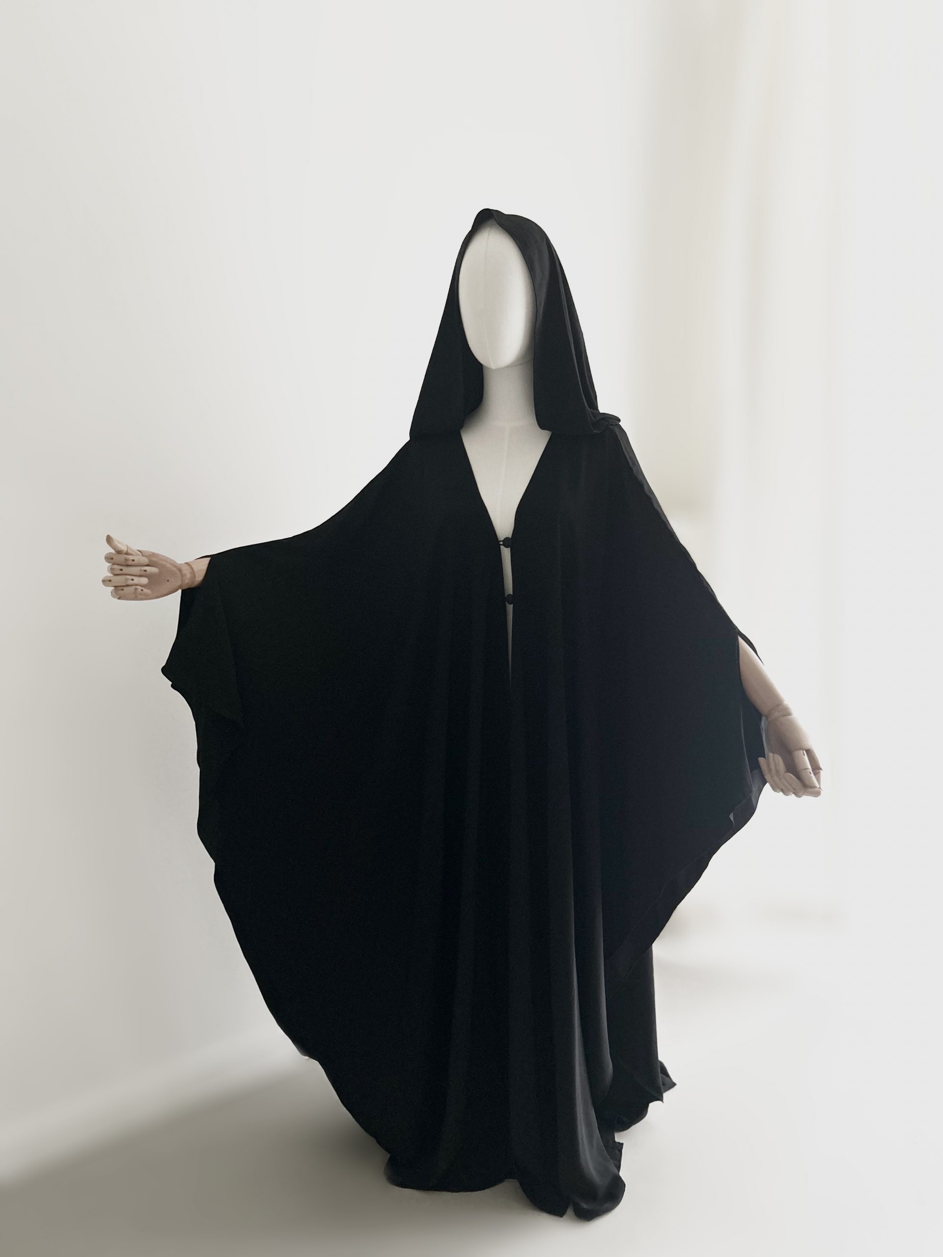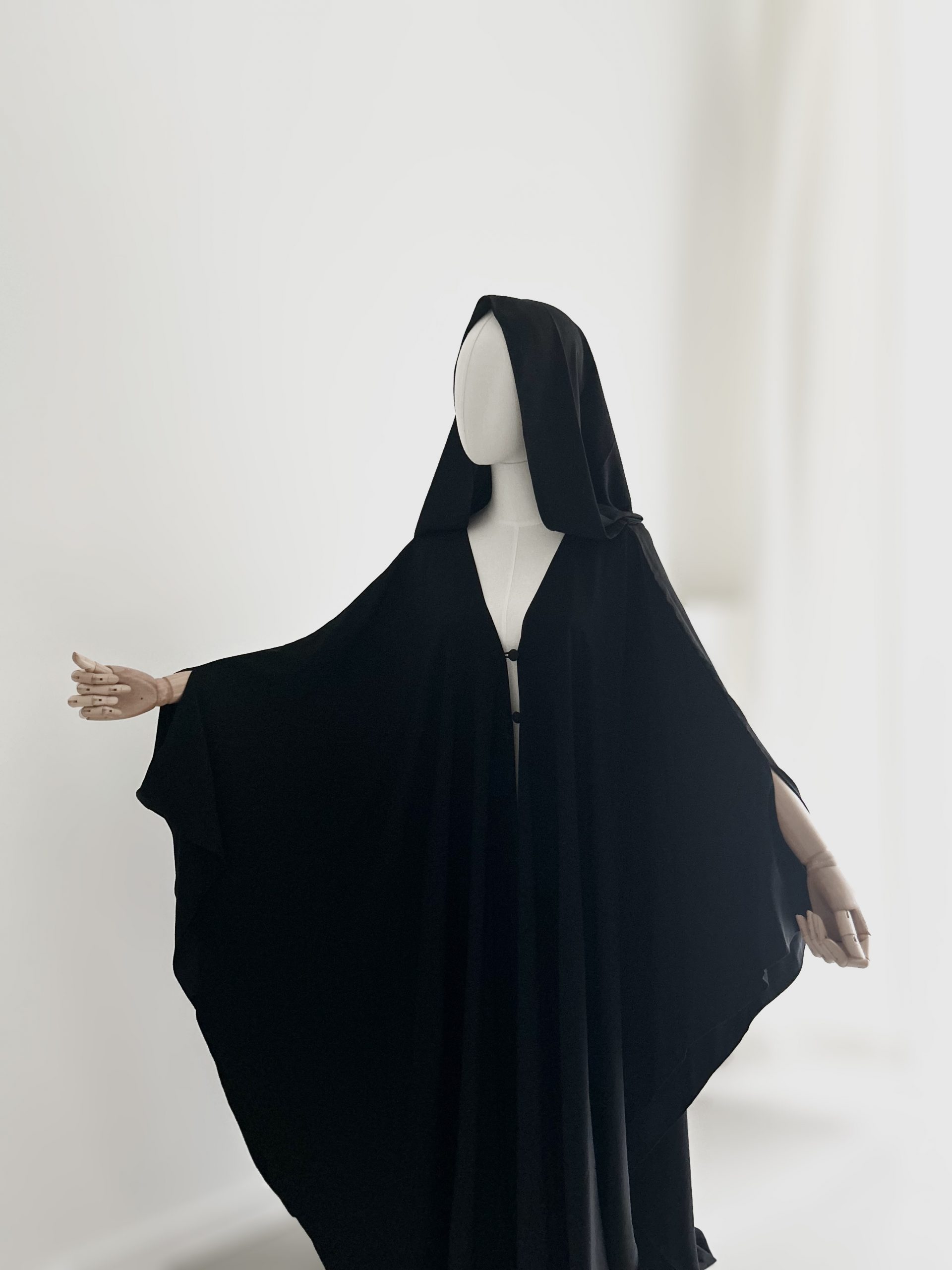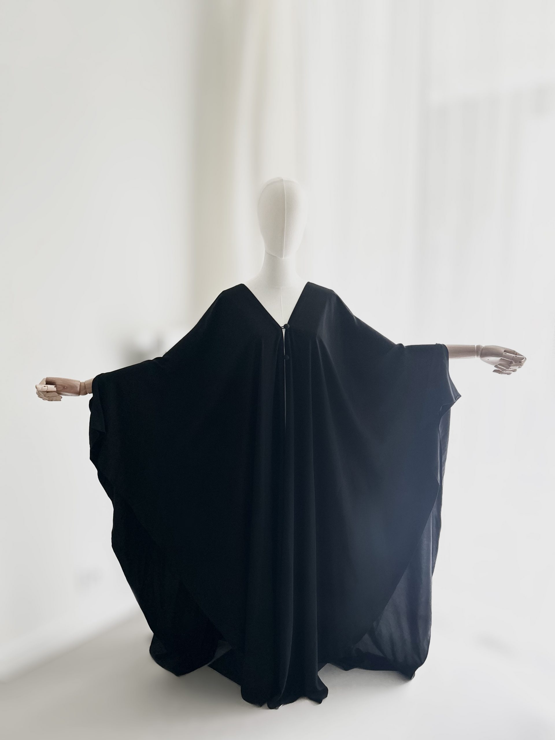 Notre Cape Rahyna est confectionnée en crêpe très légère et dispose d’une coupe papillon. Elle est la pièce idéale si l’on souhaite ajouter une touche de couvrance supplémentaire à sa tenue.